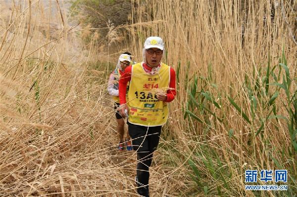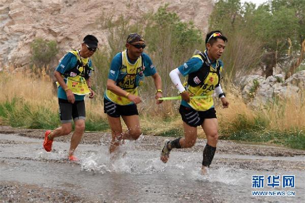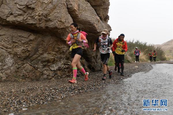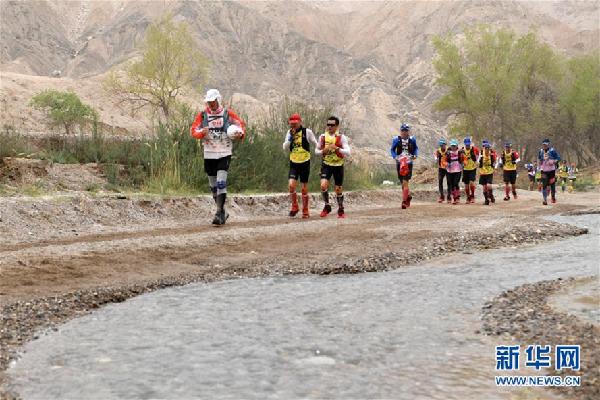 5月5日,参赛队员徒步经过涉水路段。 新华社记者范培珅摄