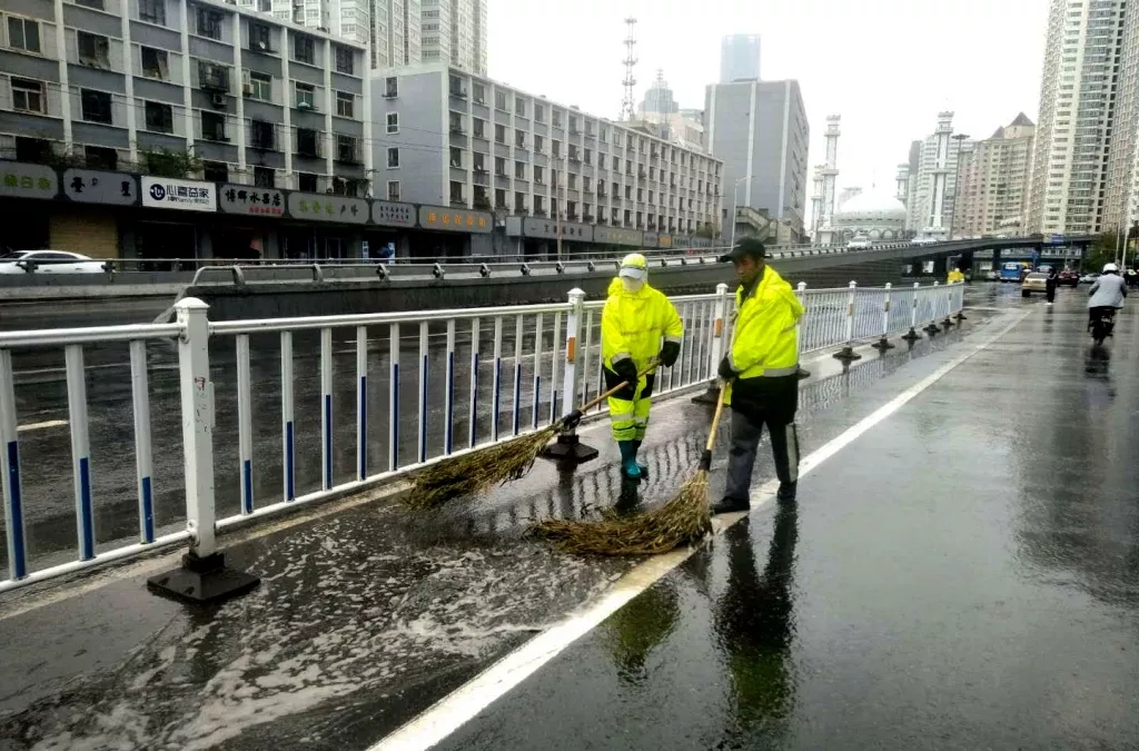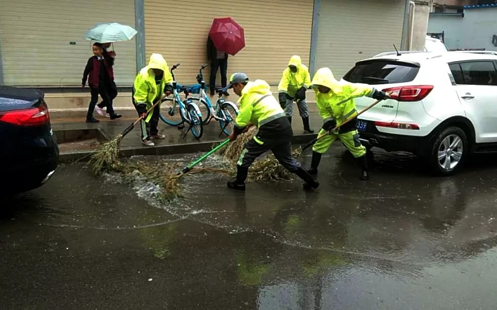 截止当天17时雨还在下,环卫排水作业仍在继续。通过四千余环卫工排积水、清理路面垃圾及擦拭绿篱、护栏和果皮箱等城市家具,加强雨天安全作业检查和考核,确保市民出行环境和城市市容。