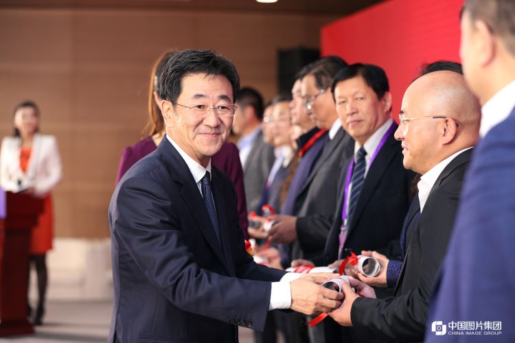 ↑新华社总经理室总经理张永平为“新华社民族品牌工程·中华老字号振兴行动”入选企业颁发证书