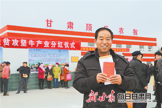 古浪县绿洲生态移民小城镇富硒牛产业园贫困户拿到分红款。(资料图)
