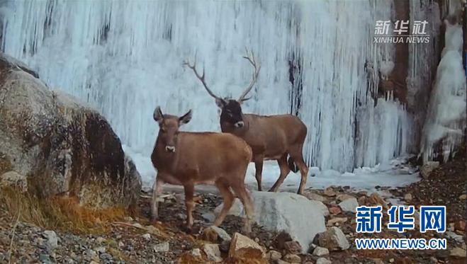 另一部相机清晰地捕捉到了一雌一雄两只白唇鹿在溪流边饮水的场景。画面以结冰的瀑布为背景,宛若童话世界。