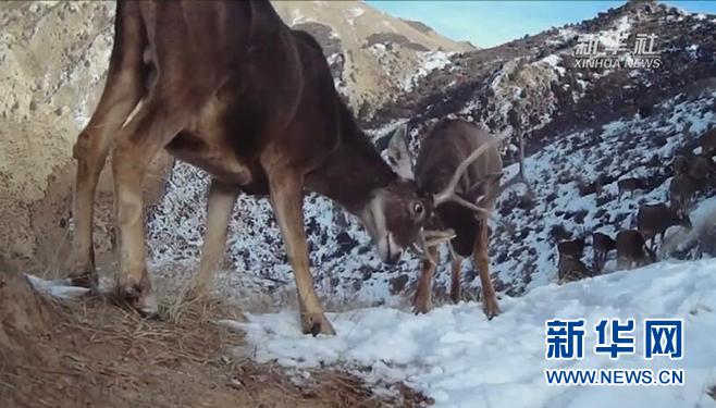 发情期的白唇鹿为了争夺配偶,雄鹿之间经常会进行争斗。红外相机也拍摄到了两只雄鹿以角为“武器”相互攻击的情景。