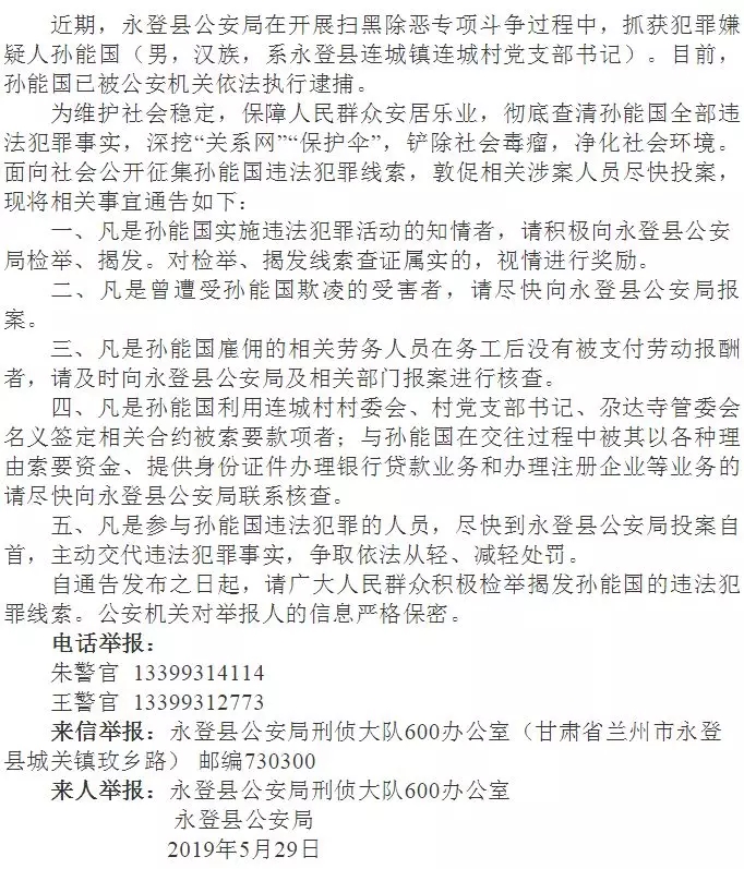 举报地址:白银市公安局扫黑除恶专项斗争领导小组办公室
