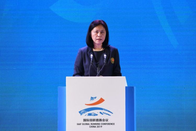 5月31日,2019国际田联路跑会议在兰州开幕,中国田径协会副主席王楠在会议上发布《中国路跑运动报告》。新华社记者范培珅摄