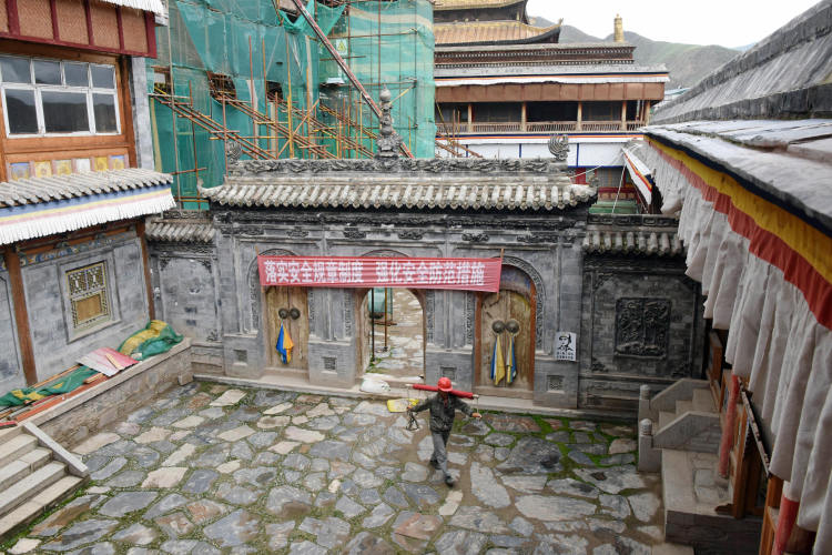 6月21日,一名工人从拉卜楞寺嘉木样寝宫1号院走过。新华社记者 陈斌 摄