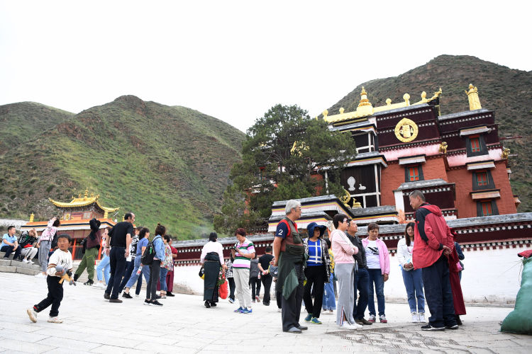 6月21日,游客和当地群众在已经完成修缮的拉卜楞寺白度母佛殿前参观。新华社记者 陈斌 摄
