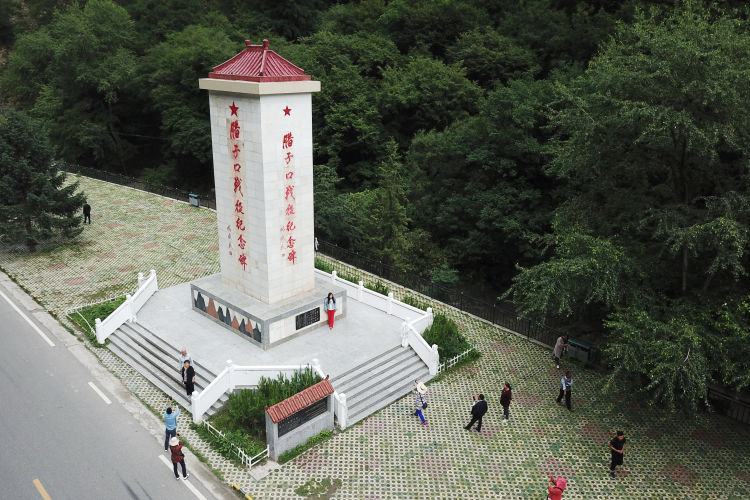 人们在腊子口战役纪念碑前参观(6月25日无人机拍摄)。