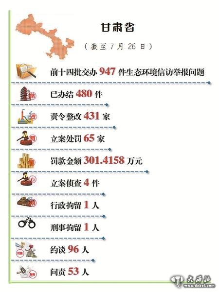 截至7月26日,中央第五生态环境保护督察组向我省交办的前十四批947件生态环境信访举报问题,已办结480件。其中,责令整改431家,立案处罚65家,罚款金额301.4158万元,立案侦查4件,行政拘留1人,刑事拘留1人,约谈96人,问责53人。