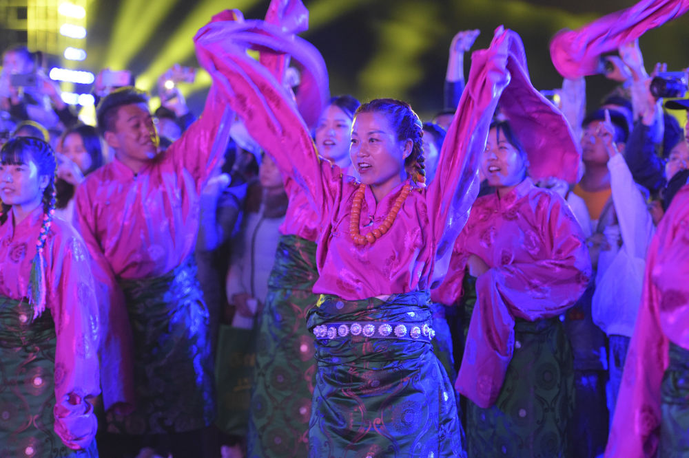 7月29日晚,演员在跳锅庄舞。新华社发(马希平摄)