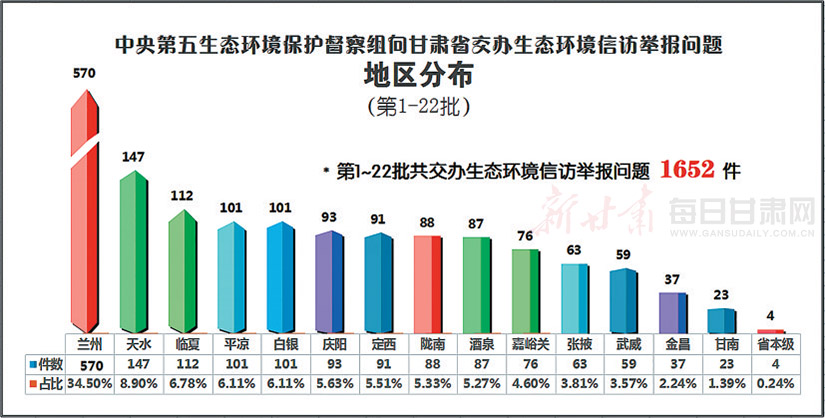 8月3日,中央第五生态环境保护督察组向甘肃省移交了第二十二批生态环境信访举报问题共100件,其中来电57件,来信43件,涉及我省14个市(州)。