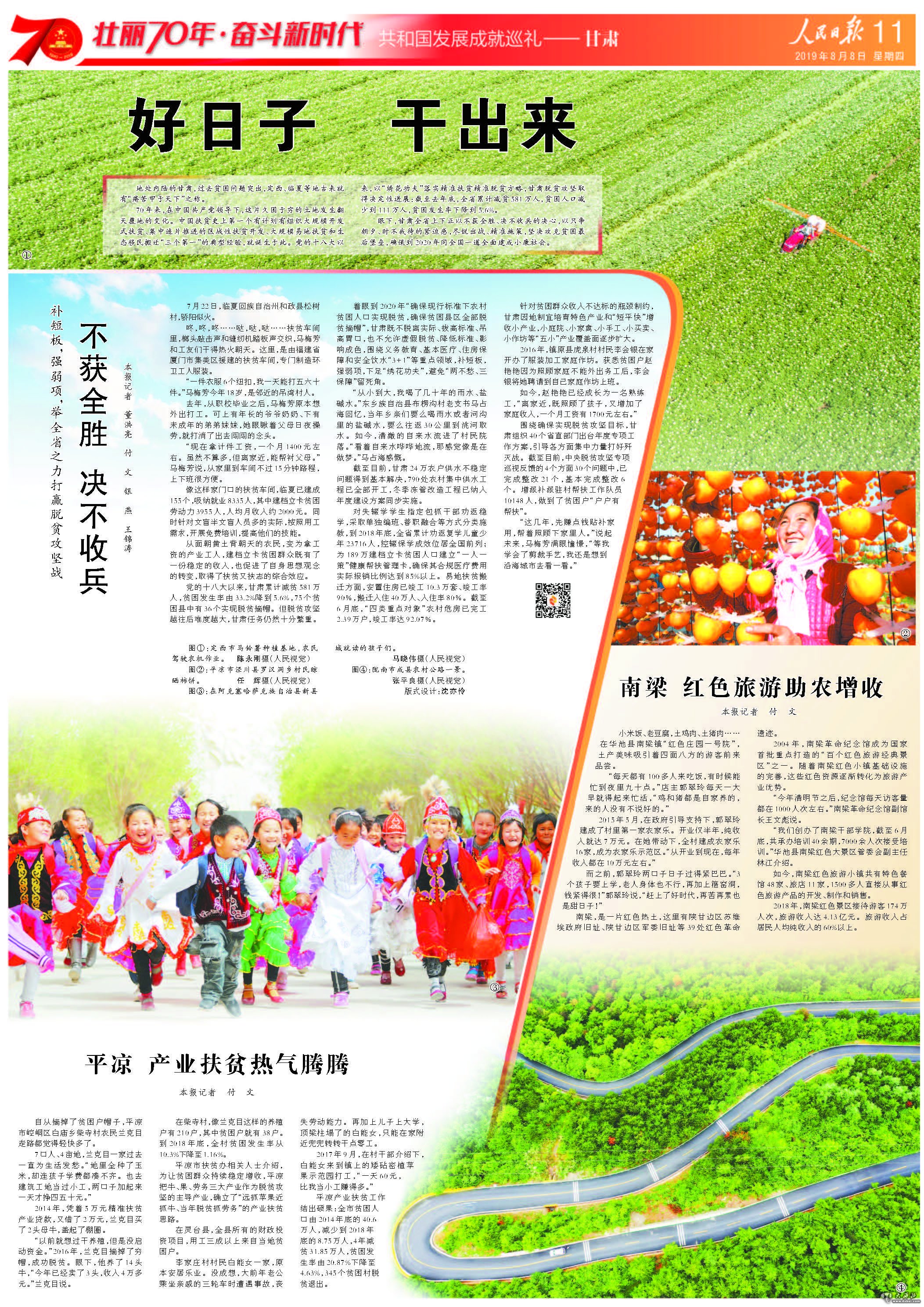 70年来,在中国共产党领导下,这片久困于穷的土地发生翻天覆地的变化。中国扶贫史上第一个有计划有组织大规模开发式扶贫、集中连片推进的区域性扶贫开发、大规模易地扶贫和生态移民搬迁“三个第一”的典型经验,就诞生于此。党的十八大以来,以“绣花功夫”落实精准扶贫精准脱贫方略,甘肃脱贫攻坚取得决定性进展:截至去年底,全省累计减贫581万人,贫困人口减少到111万人,贫困发生率下降到5.6%。