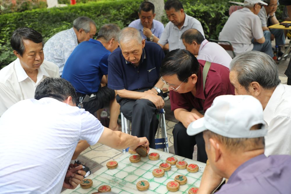 8月7日,在黄河风情线一处绿荫下,市民们聚在一起下象棋。(任延昕摄)