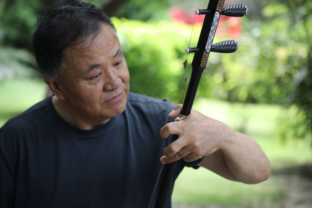 8月7日,在黄河风情线一处绿荫下,一位老人在拉二胡。(任延昕摄)
