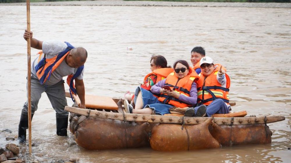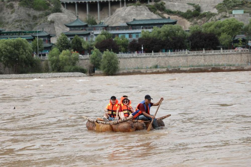 8月7日,游客乘坐羊皮筏子在黄河上漂流。(杜哲宇摄)