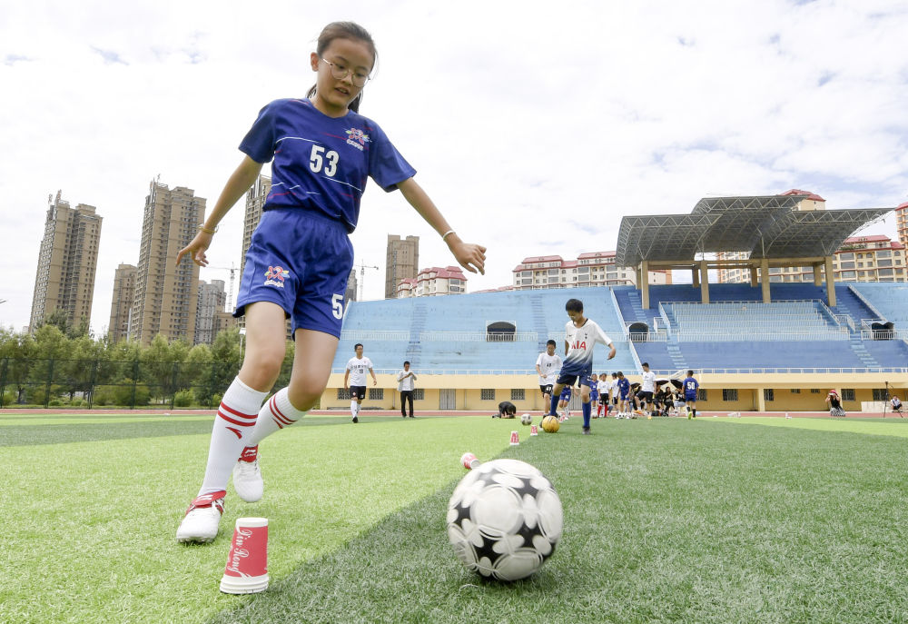 8月13日,甘肃省临夏市一家足球俱乐部的小学生赵海婷进行控球训练。新华社记者马宁摄