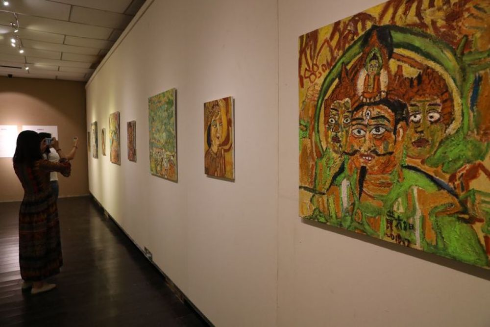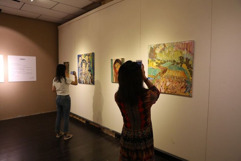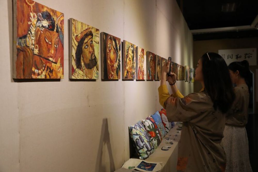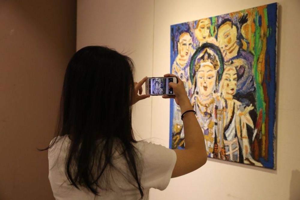 8月14日,观众在敦煌市敦煌画院参观。当日,“回到敦煌”自闭症公益画展在甘肃省敦煌市开幕,展览共展出特殊教育学校——杭州市杨绫子学校学生绘画的近60幅壁画油画。此次公益画展的举办,让人们通过特殊孩子的绘画作品,走近自闭症群体,与他们进行心灵沟通和交流。(周斌全)
