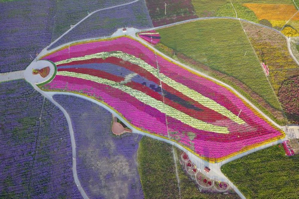 白银市白银区现代农业科技示范园的大坪“凤园花海”(8月13日无人机拍摄)。新华社记者范培珅摄