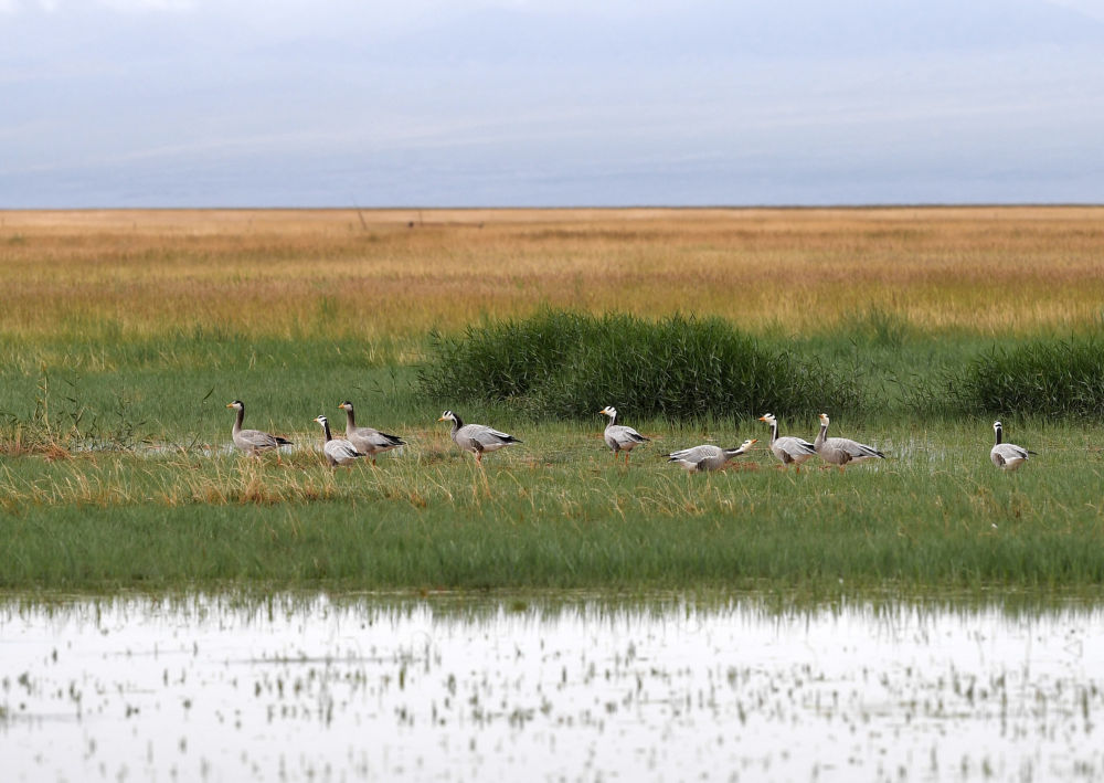 8月22日,在甘肃阿克塞海子草原,一群斑头雁在湿地休憩。新华社记者马宁摄