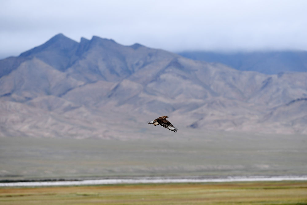 8月22日,一只大鵟在甘肃阿克塞海子草原上飞翔。新华社记者马宁摄