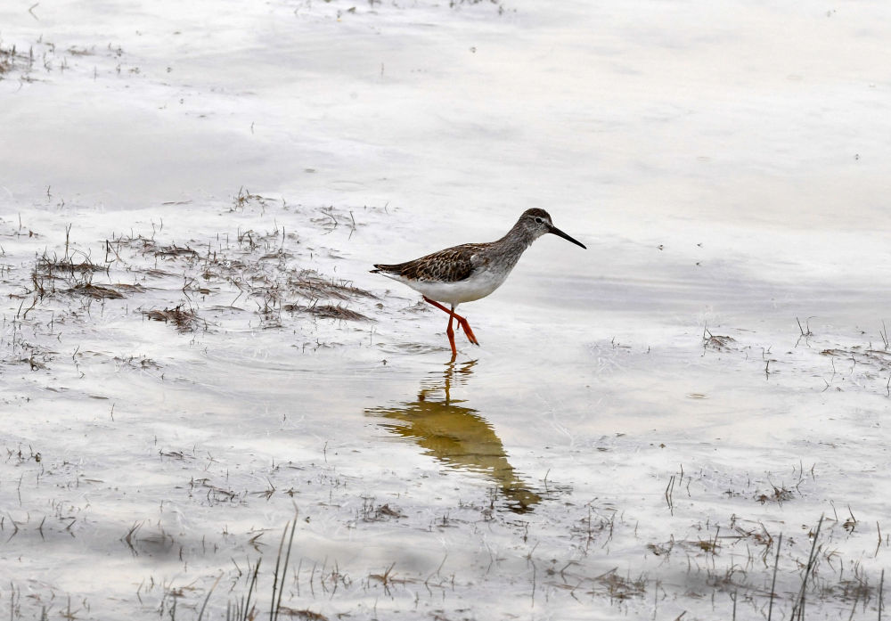 8月22日,在甘肃阿克塞海子草原,一只红脚鹬在湿地觅食。新华社记者马宁摄