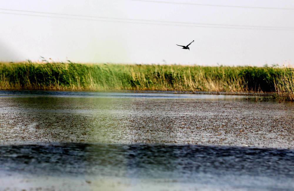 一只候鸟在青土湖水面飞翔(6月13日摄)。位于巴丹吉林沙漠和腾格里沙漠夹缝中的青土湖,是甘肃省武威市民勤县的“沙漠之湖”,也是当地生态变迁的“晴雨表”。新华社记者郭刚摄