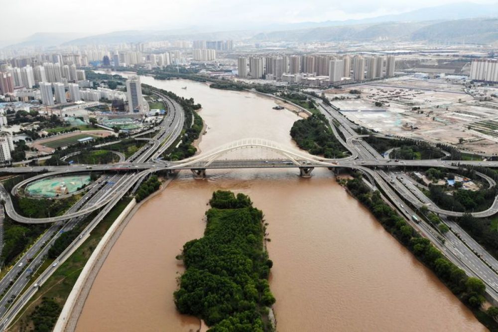 黄河兰州段的深安黄河大桥(6月11日无人机拍摄)。新华社记者范培珅摄