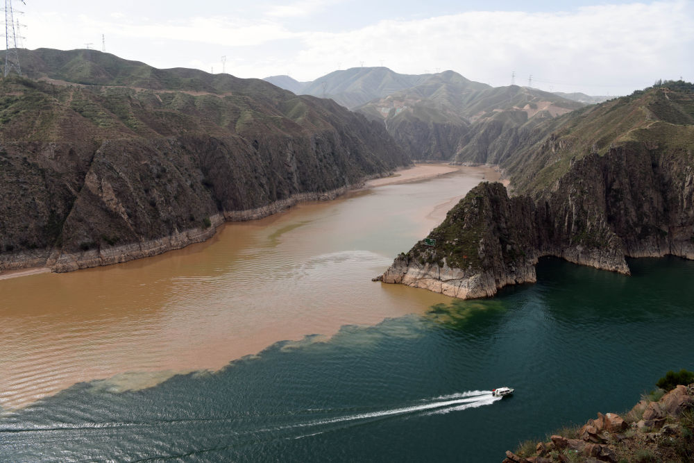 在甘肃省永靖县刘家峡水库,一艘快艇在洮河和黄河的汇合水域行驶(6月2日摄)。新华社记者马宁摄