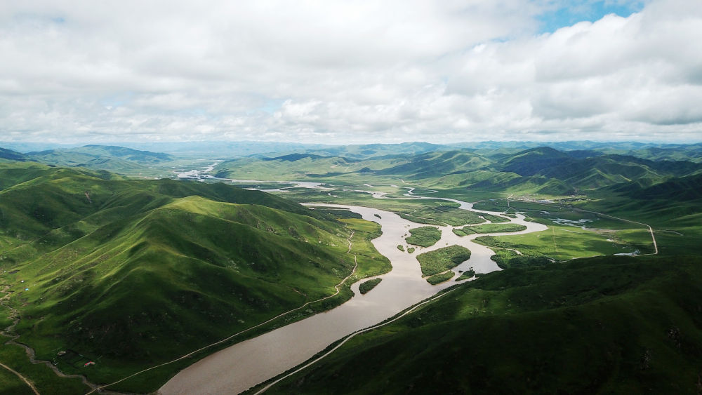 黄河流经的甘肃省甘南藏族自治州玛曲县境内湿地和草原(6月23日无人机拍摄)。新华社记者陈斌摄