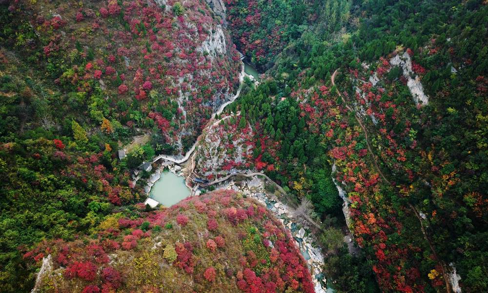 甘肃省陇南市成县西狭颂景区的秋季风景(2018年10月16日无人机拍摄)。新华社记者陈斌摄