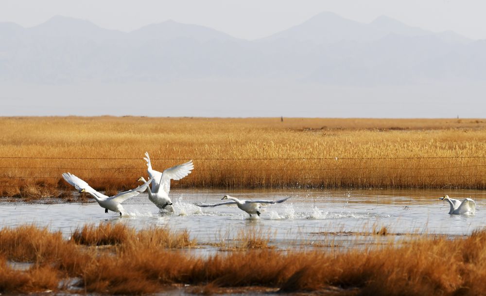 几只白天鹅从甘肃省酒泉市阿克塞哈萨克族自治县境内的小苏干湖湿地水面起飞(4月5日摄)。新华社记者陈斌摄