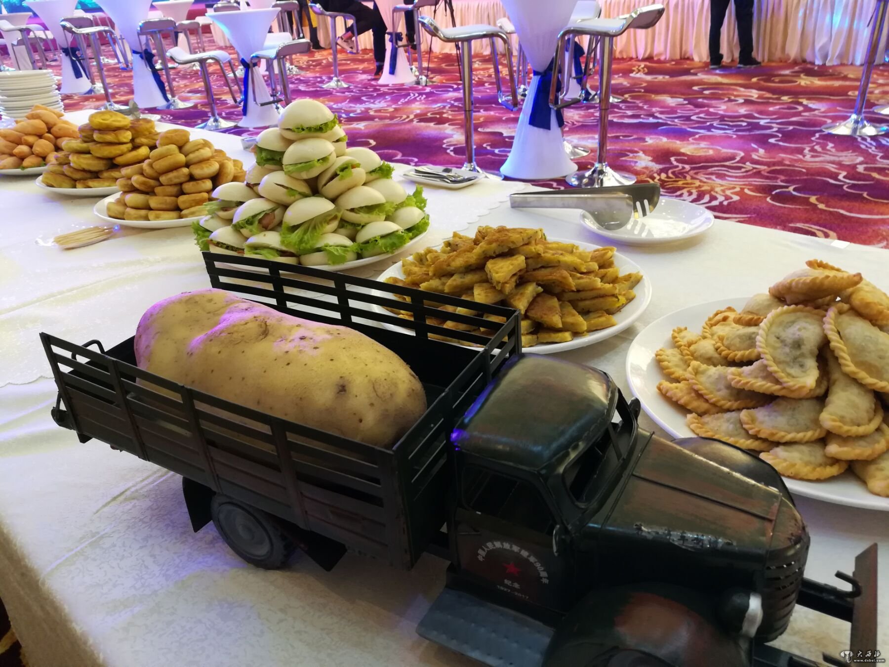 展区左侧一溜用大盘摆放着色泽鲜艳的马铃薯,其中一辆“”大卡车“”上拉着一个大马铃薯,让人看了喜不自禁。工作人员介绍,马铃薯百味宴实际是用马铃薯,制作出的100多个艺术造型,并非是用马铃薯制作出100多种口味的美食。