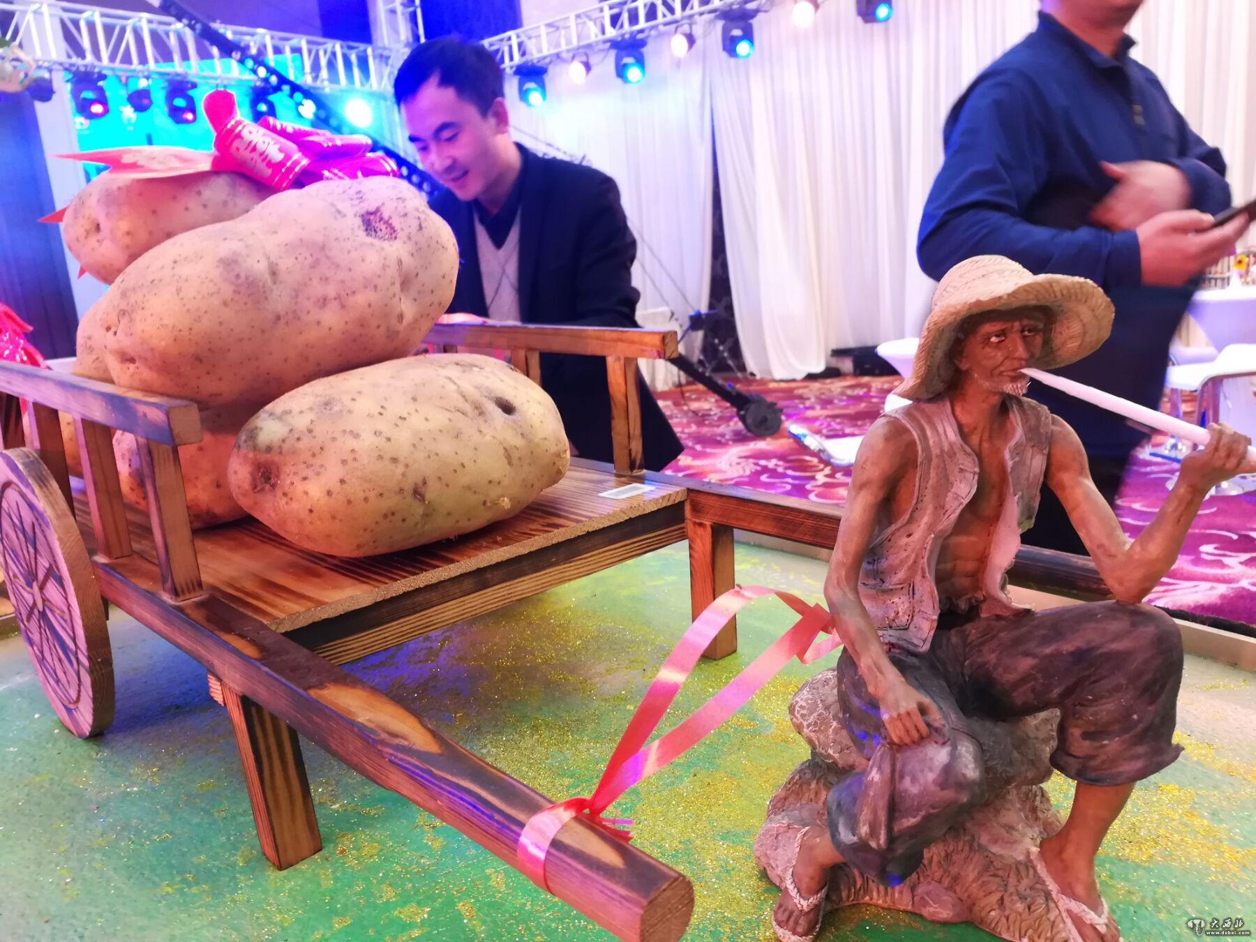 凤凰造型前面有个架子车,车上拉着马铃薯。一位老农停下车子,坐在车把上抽旱烟。造型惟妙惟肖,把老农外表和内心刻画得入木三分,来宾看到这个造型纷纷点头称赞。