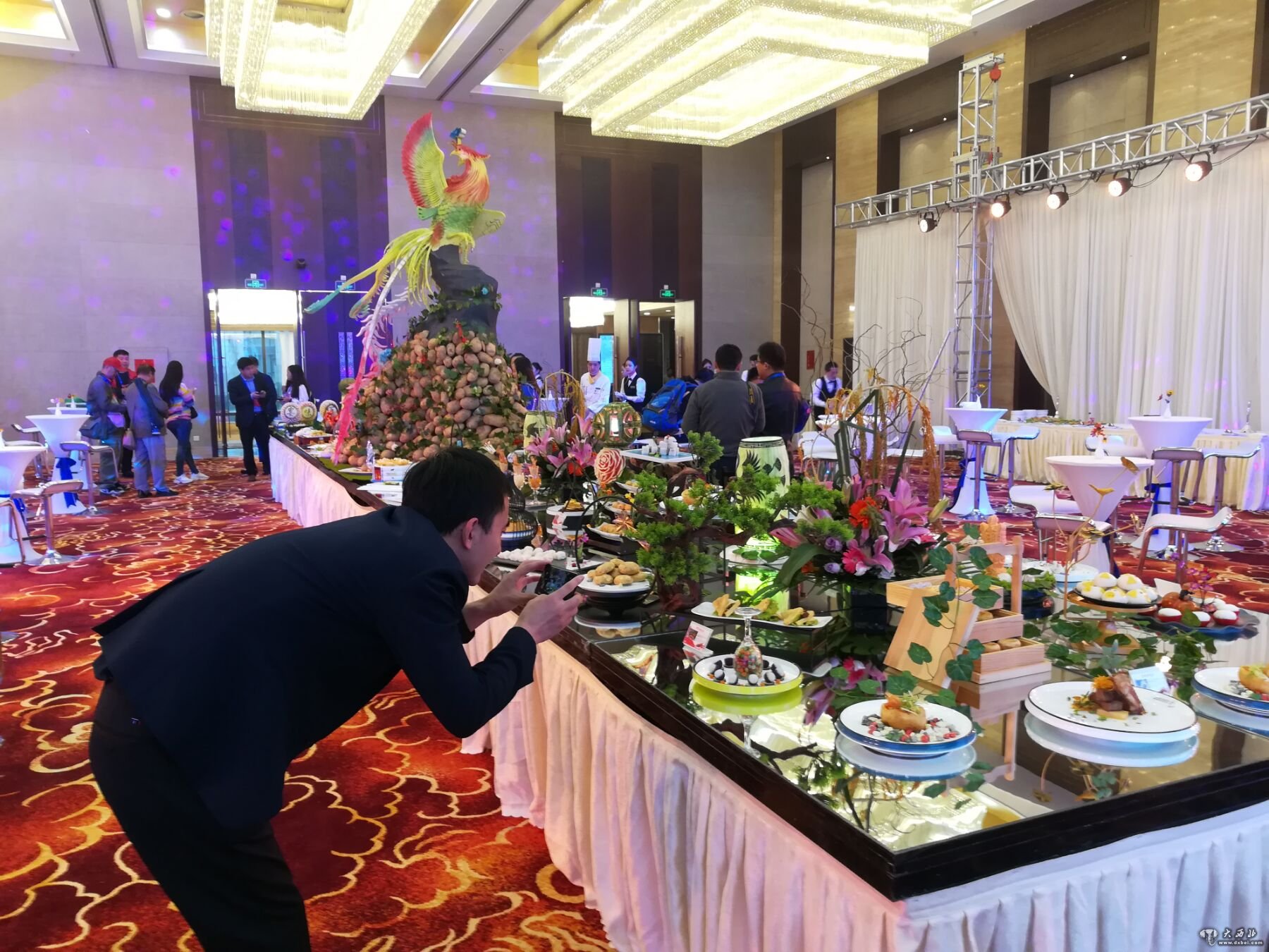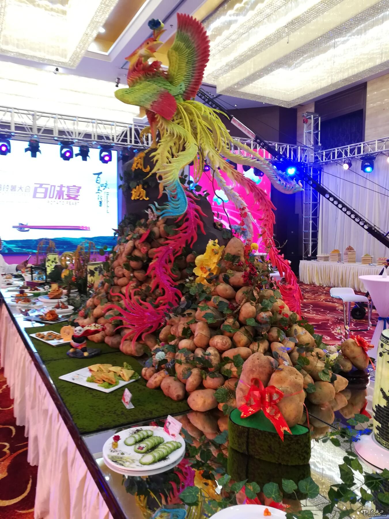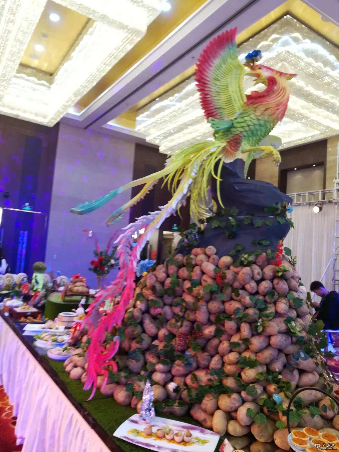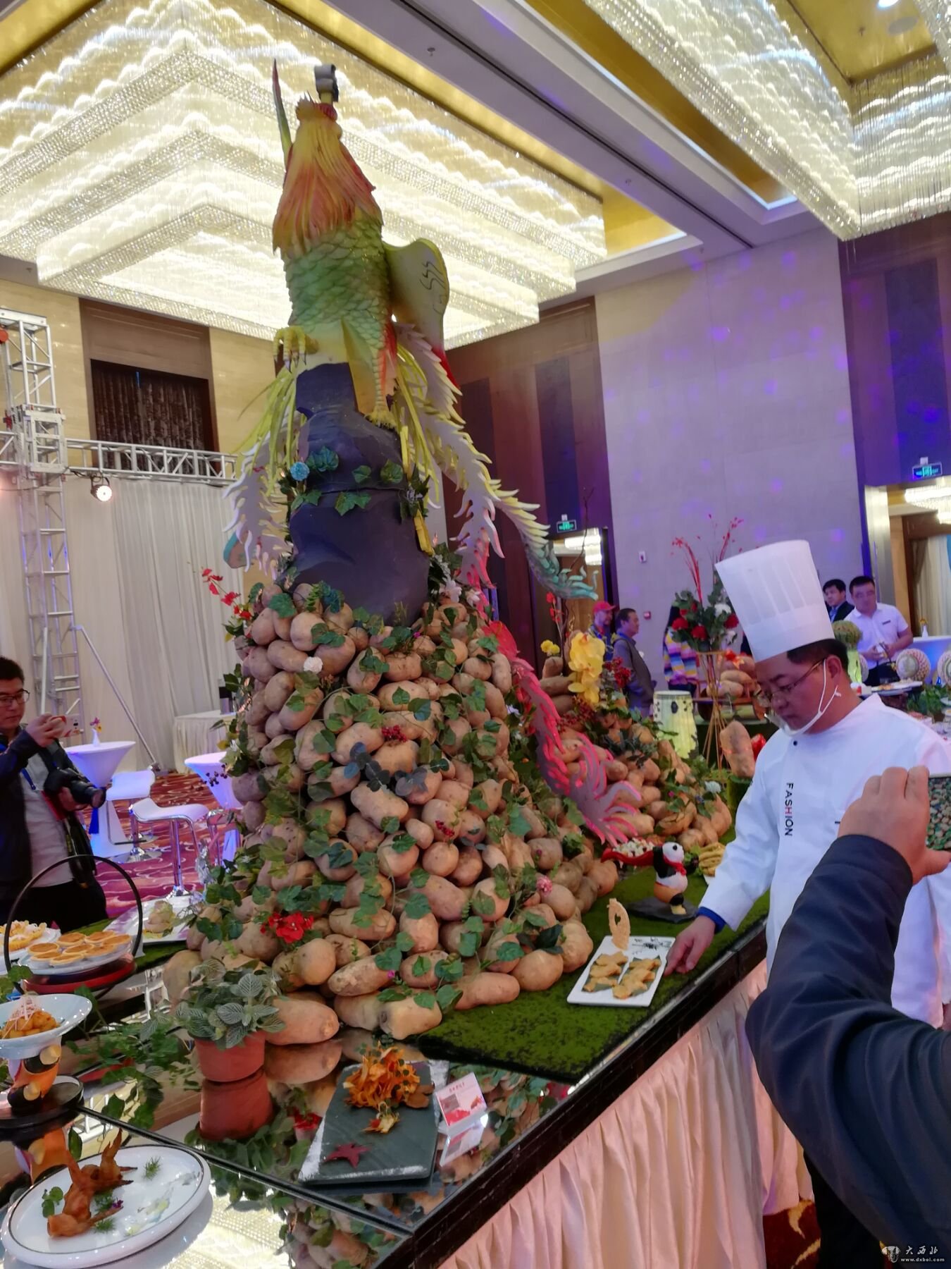 造型中央是一个马铃薯堆砌而成的凤凰,马铃薯制作得凤凰外身,恰如凤凰特色鲜明的漂亮外表,该造型精美独特让人赏心悦目,引来众位老记和来宾争相拍照。