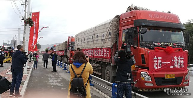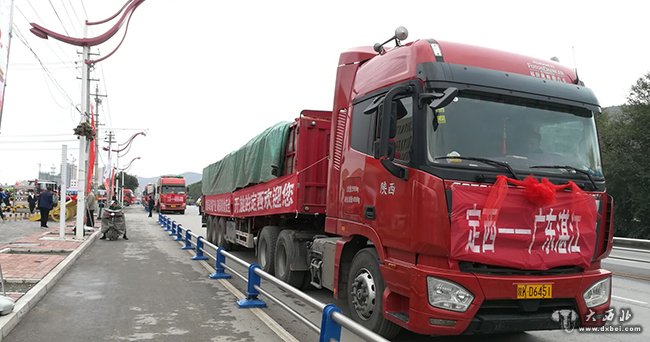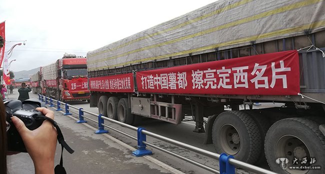 霎时,响起几声震耳的礼炮声。伴随着欢快的音乐声,50辆身披红色横幅的重型卡车徐徐驶出市场,这些车辆组成了一条浩荡长龙,引来众多市民围观拍照。“没想到家乡这么多的马铃薯销往了国内一线大城市,定西真正成了名副其实的‘’薯都‘’”了!一位拍照的定西市民自豪的说到。