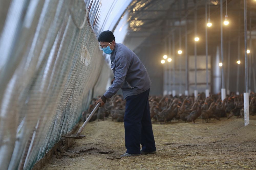 10月25日,在甘肃省天水市秦安县中山镇的蛋鸭养殖大棚内,一名农民在清理维护大棚。新华社发(杜哲宇摄)