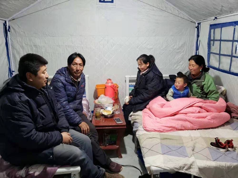 10月28日,夏河县达麦乡受灾群众贡保当知一家在安置帐篷里用上了电褥子。新华社发