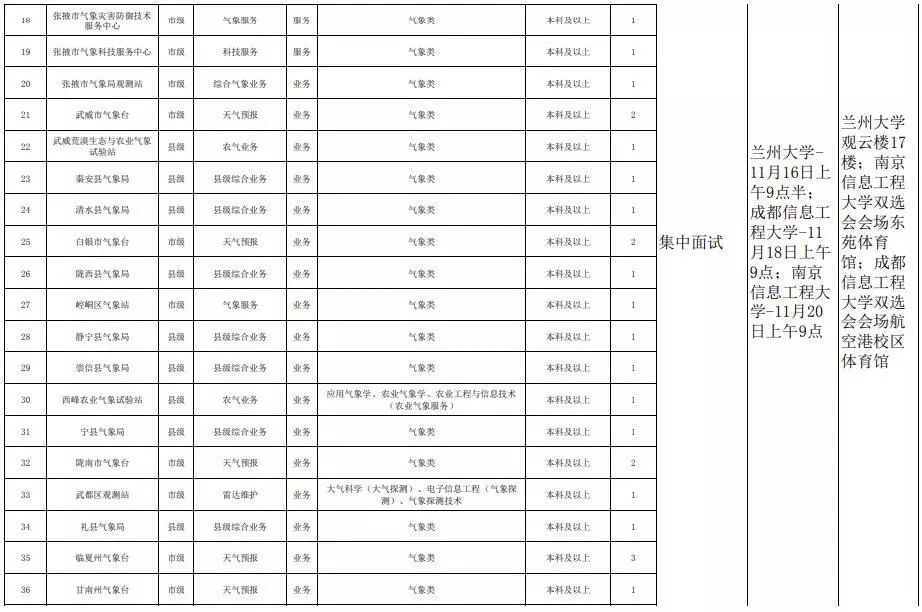根据需要,在兰州大学(11月16日)、成都信息工程大学(11月18日)、南京信息工程大学(11月20日)人才招聘会当天下午(地点另行通知)对市(州)气象局和县级气象局气象类专业本科及以上学历要求岗位进行集中面试。面试采用结构化面试形式,面试内容为岗位所需专业知识及综合能力要求,每个岗位面试成绩第一名进入后续环节。