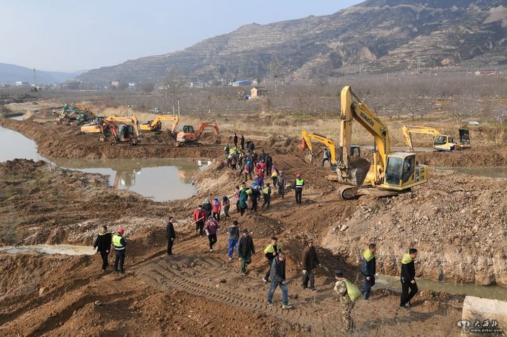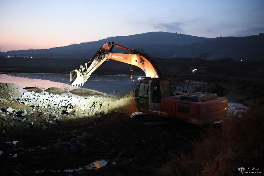 11月27日,在天水市张家川回族自治县龙山镇境内,当地政府组织工程机械修建临时围堰。新华社记者范培珅摄