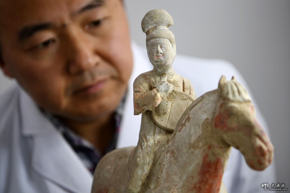 12月27日,在天水市博物馆文物保护修复中心陶、玉石器文物修复室,专业技术人员孟旭辉在观察一件唐代彩绘陶俑的病害情况。新华社记者马宁摄
