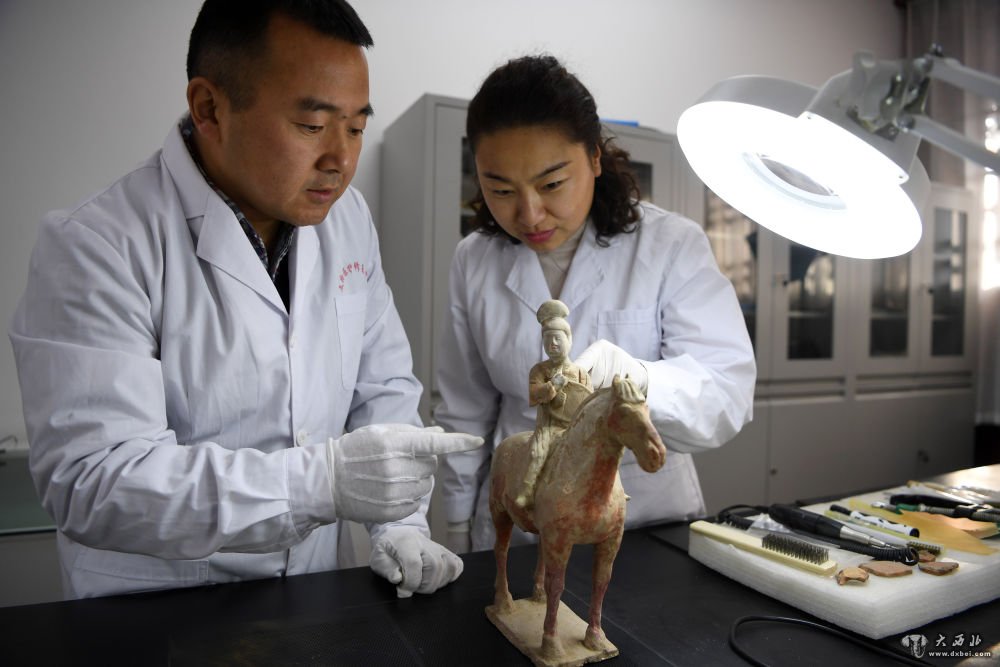 12月27日,在天水市博物馆文物保护修复中心陶、玉石器文物修复室,专业技术人员孟旭辉(左)和董粝商讨一件唐代彩绘陶俑的修复方案。新华社记者马宁摄