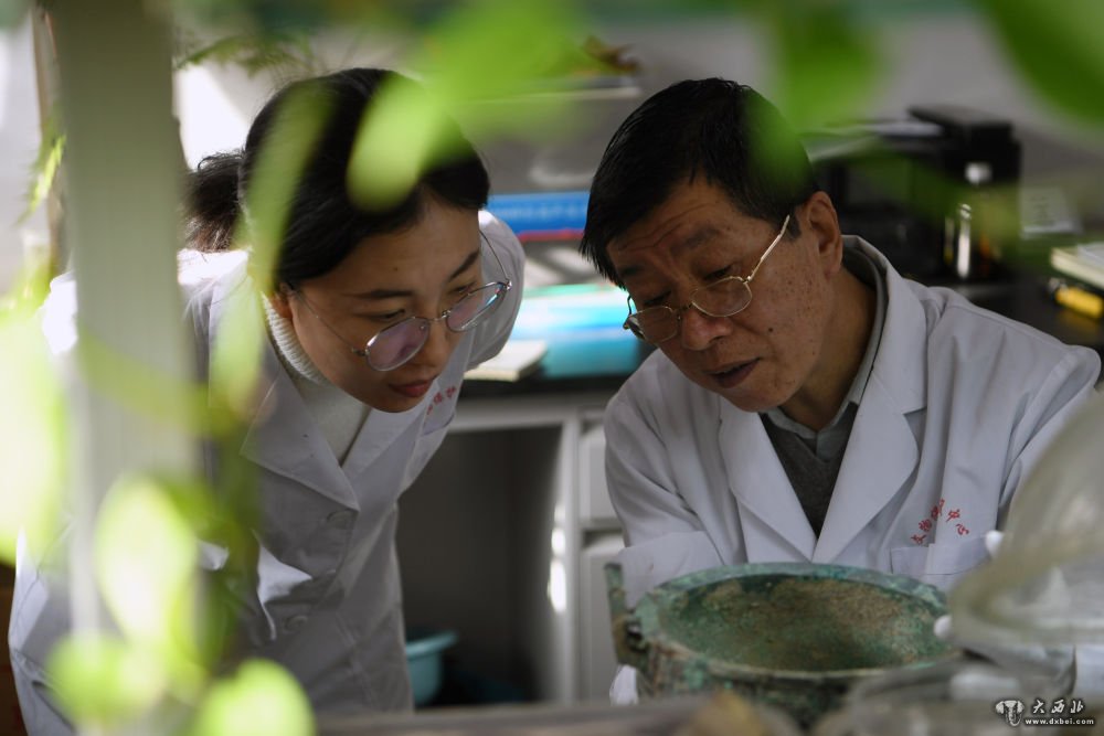 12月26日,在天水市博物馆文物保护修复中心金属文物修复室,专业技术人员李小龙(右)和杨帆在修复一件春秋时期的青铜鼎。新华社记者马宁摄