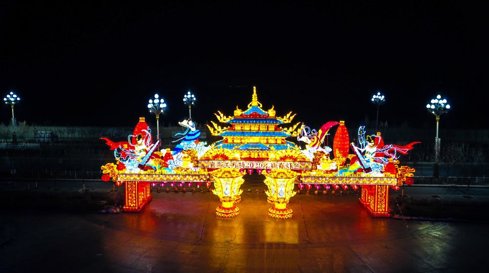 位于园区正门口的“飞天乐舞”灯组。(嘉峪关方特供图)