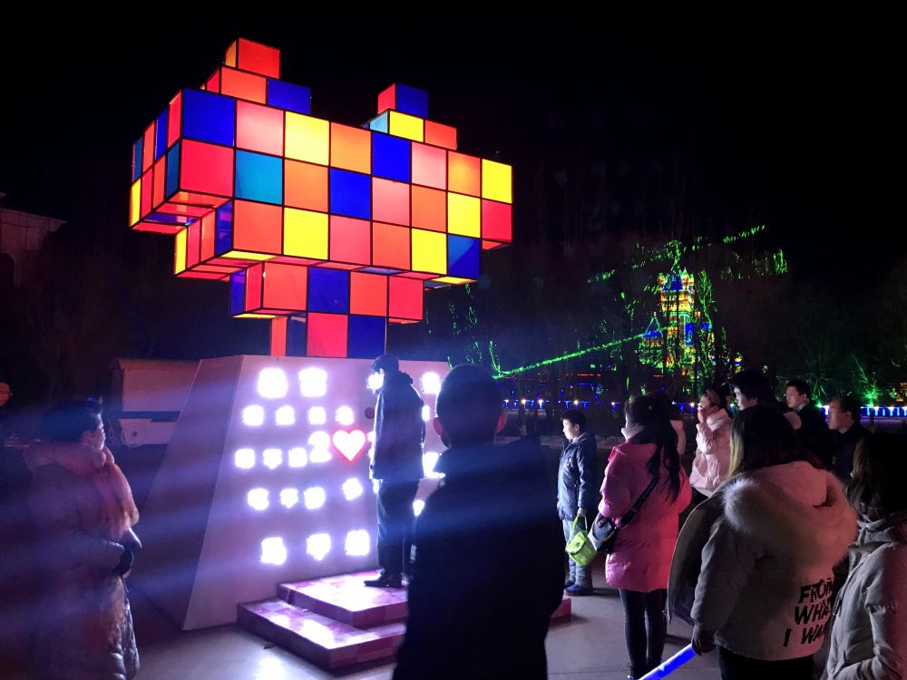 游客与“心动心语”花灯互动。(嘉峪关方特供图)