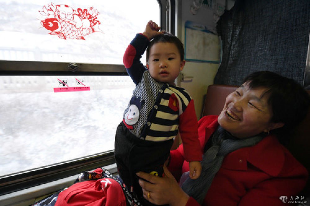 1月10日,在由兰州开往武威南的7505次列车上,从兰州探亲归来的把兰儒(右)和一岁半的小孙子乘车,准备返回永登县。新华社记者马宁摄