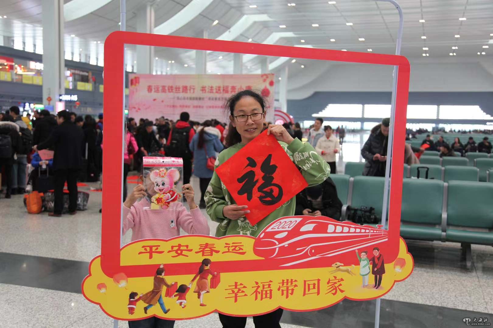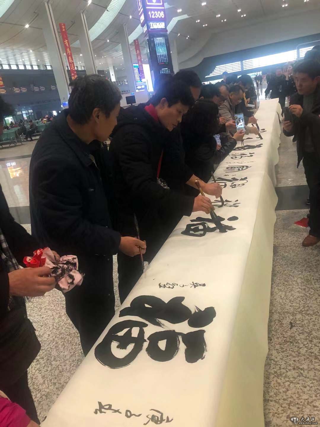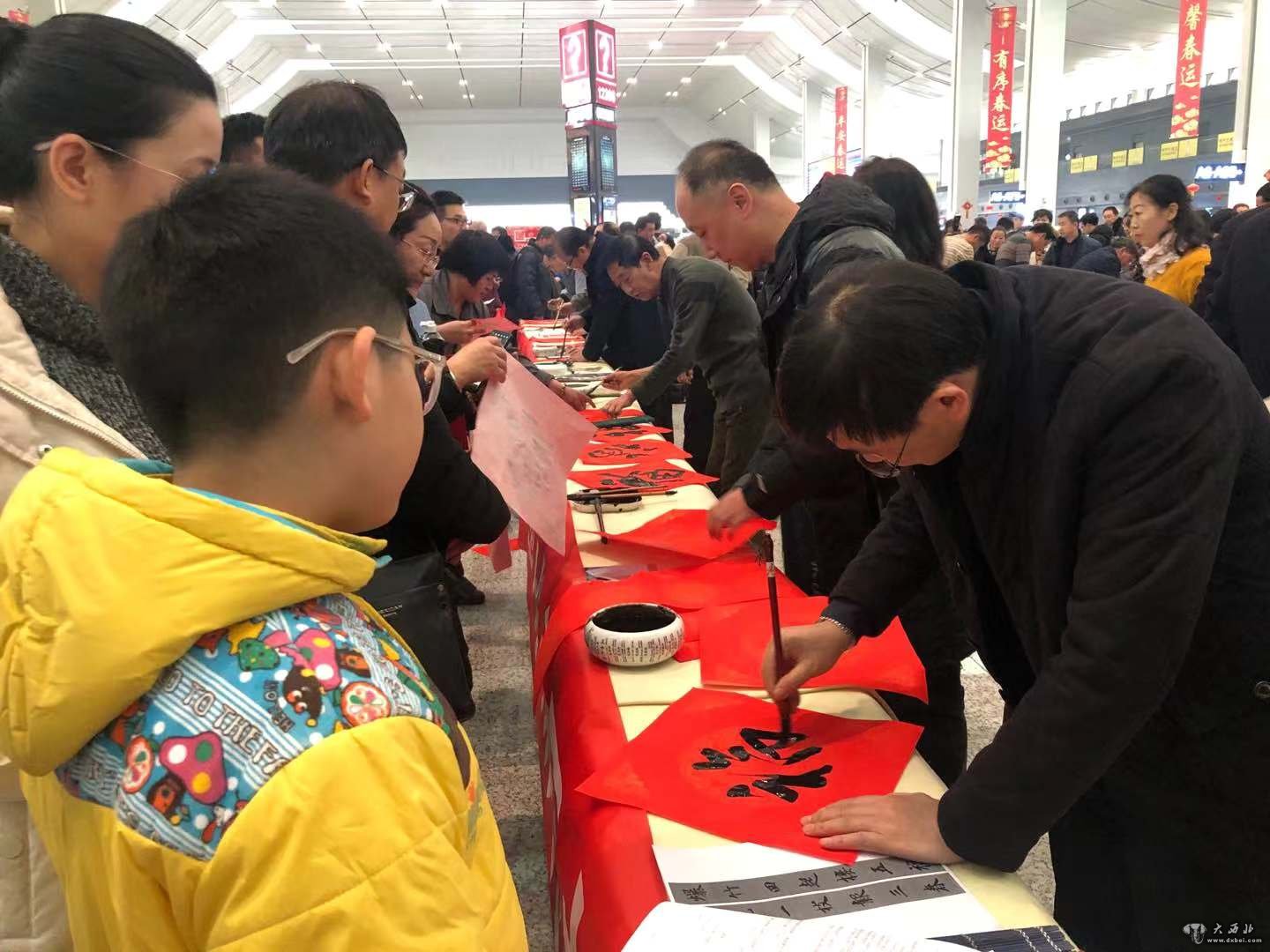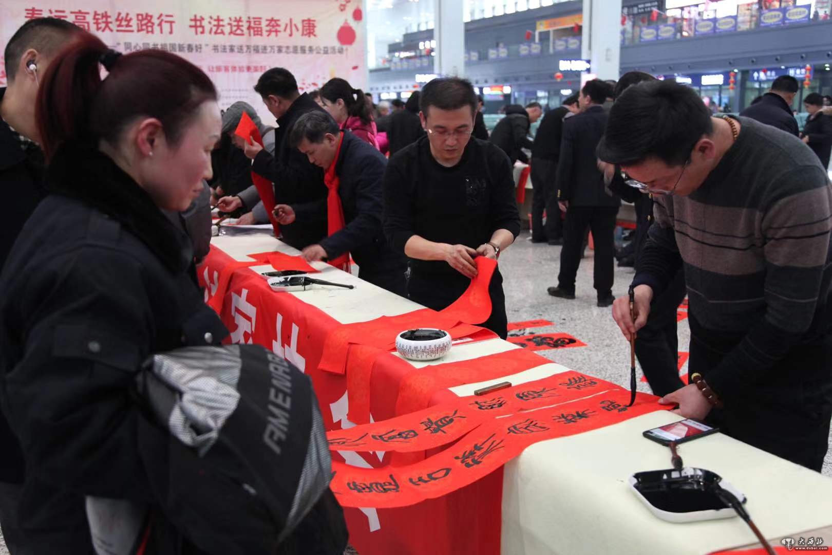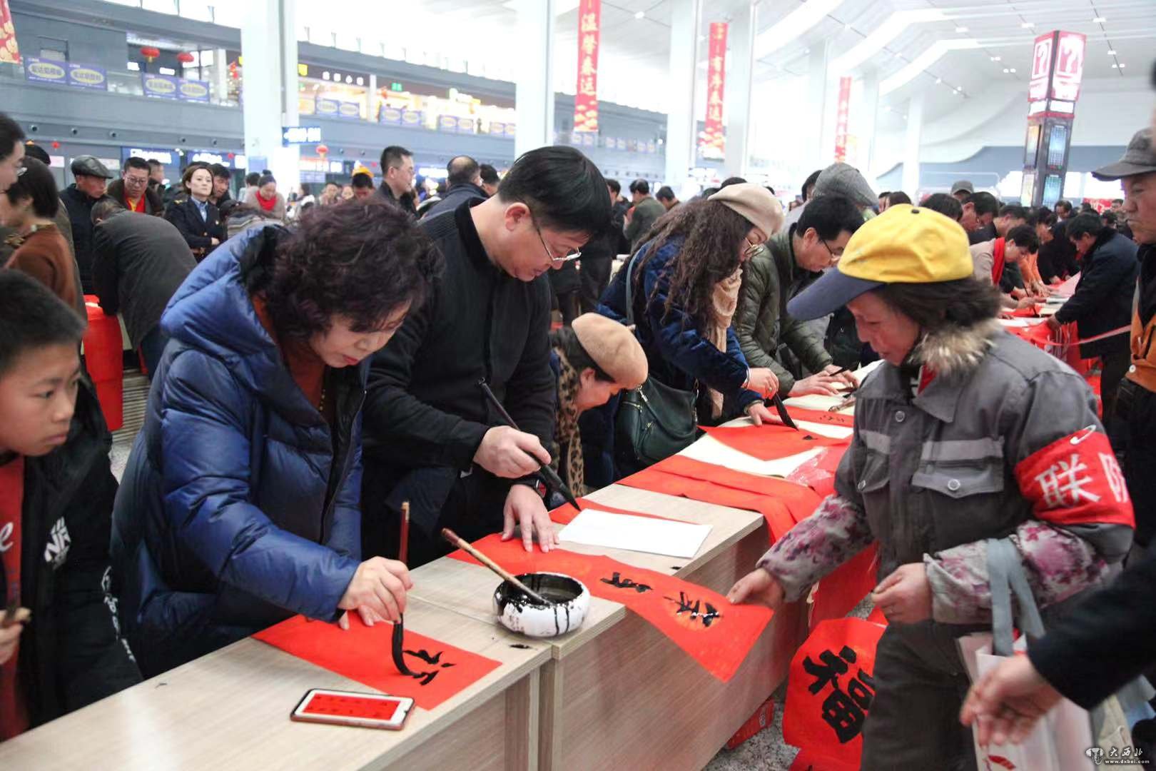 不远处,60余名书法家现场挥毫泼墨,为广大旅客和铁路职工送福送春联。由兰州局集团公司和甘肃省书法家协会主办的“春运高铁丝路行书法送福奔小康”书法家送万福进万家志愿服务公益活动走进兰州西站,天水南站、通渭站、定西北站、武威站、张掖西站、高台站、嘉峪关南站、敦煌站等9个丝路节点铁路车站也同步启动了这项公益活动,营造了浓厚的年俗文化氛围。