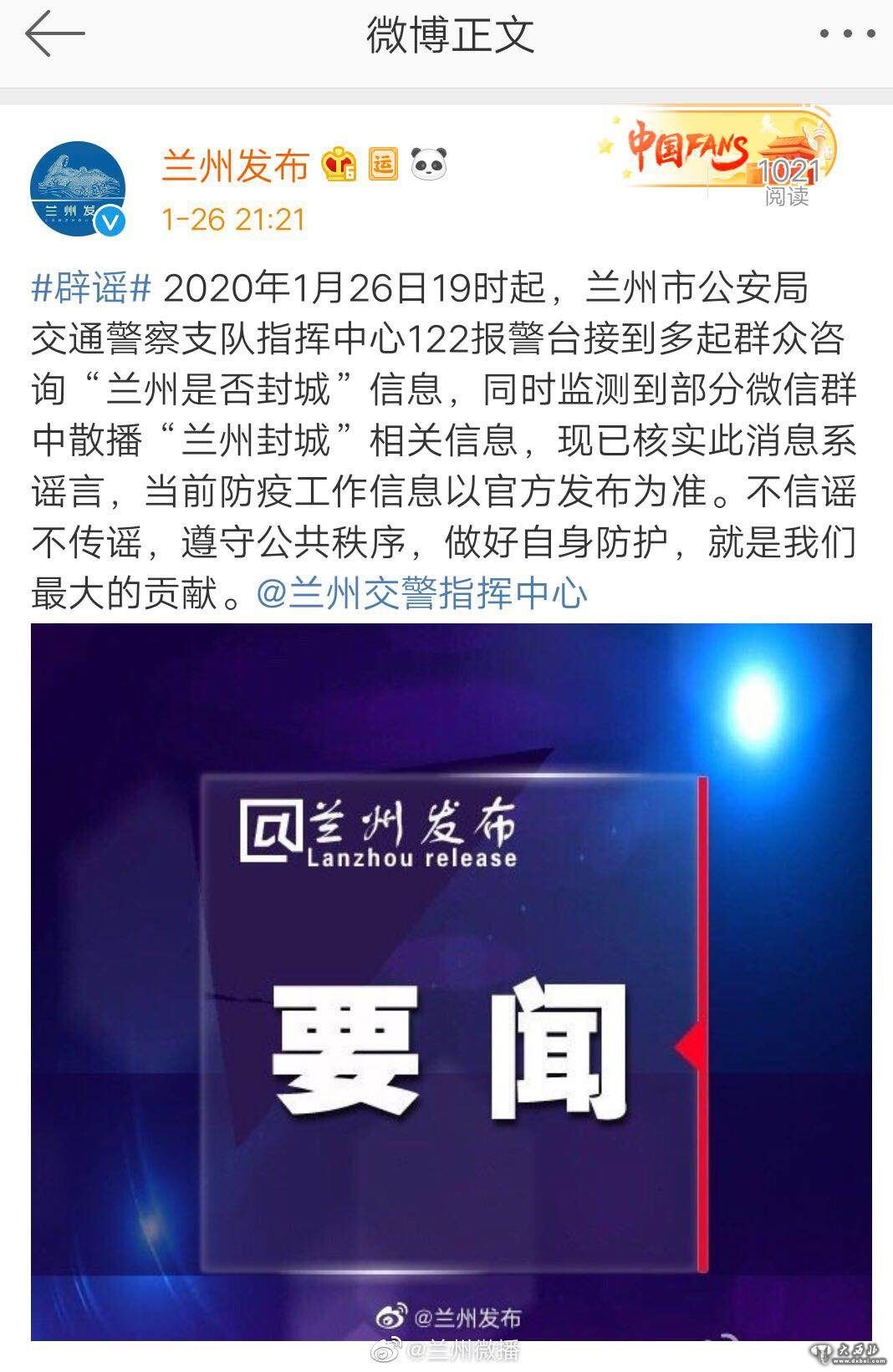 2020年1月26日19时起,兰州市公安局交通警察支队指挥中心122报警台接到多起群众咨询“兰州是否封城”信息,同时监测到部分微信群中散播“兰州封城”相关信息,现已核实此消息系谣言,当前防疫工作信息以官方发布为准。不信谣不传谣,遵守公共秩序,做好自身防护,就是我们最大的贡献。