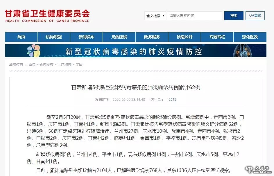 截至2月5日20时,甘肃新增5例确诊病例累计62例兰州无新增