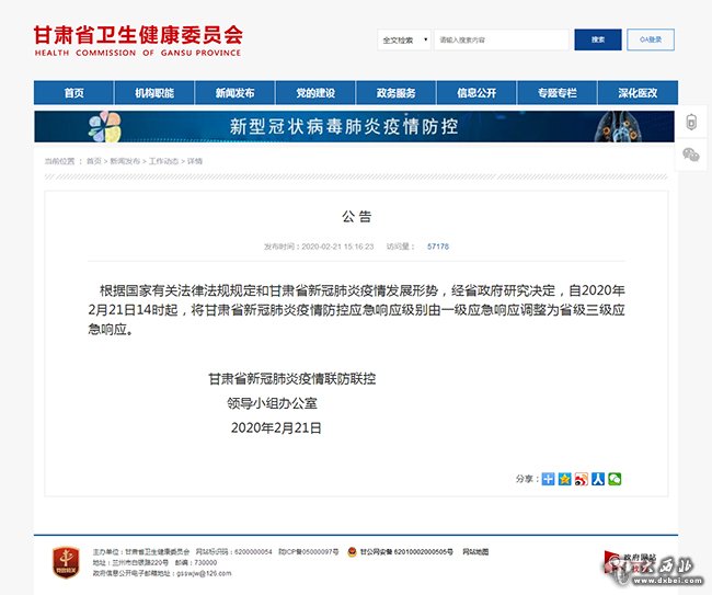 根据国家有关法律法规规定和甘肃省新冠肺炎疫情发展形势,经省政府研究决定,自2020年2月21日14时起,将甘肃省新冠肺炎疫情防控应急响应级别由一级应急响应调整为省级三级应急响应。