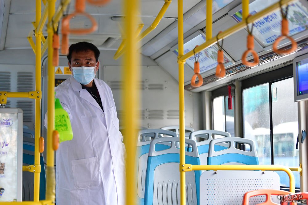 3月2日,兰州公交集团工作人员尹春军在给一辆公交车消毒。新华社记者陈斌摄