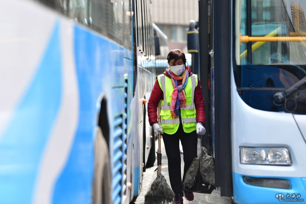 3月2日,一名环卫工人在公交站场进行保洁工作。新华社记者陈斌摄